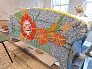 Het vinden van een geschikte locatie om te mozaïeken bleek een uitdaging, maar dankzij een gouden tip van Hans van Mitra Han&Hans mochten we aan de slag in De Wildeman bij Roel en Maartje van de Ven. Vrijwilligers hebben de ruimte in orde gemaakt, met hulp van Martien van de Heijden (Woontrend) die de vloerbedekking legde. Toen de zware bank van zo’n 2.000 kg werd geleverd, schoot Mark van Roy met zijn verreiker te hulp – een spannend moment, maar het is gelukt!